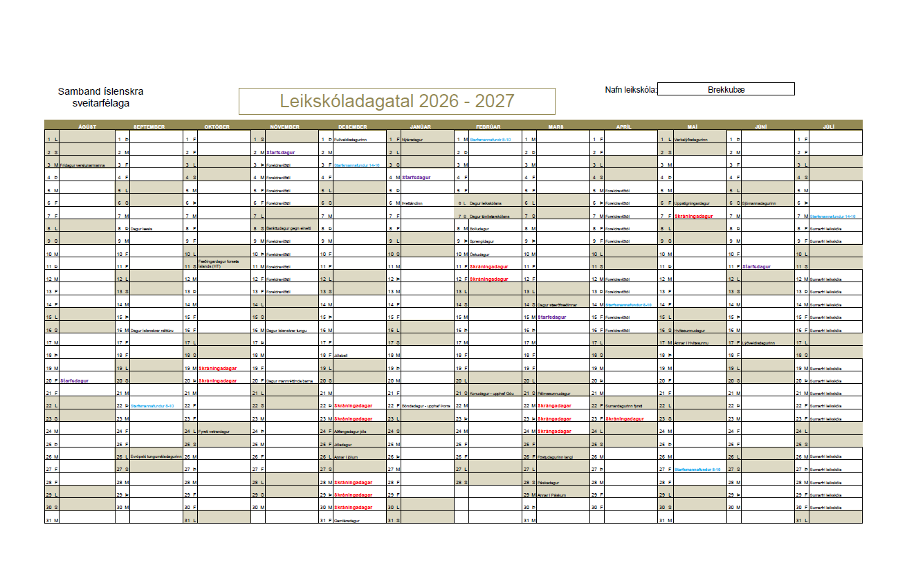 Skóladagatal Brekkubæjar 2026-2027